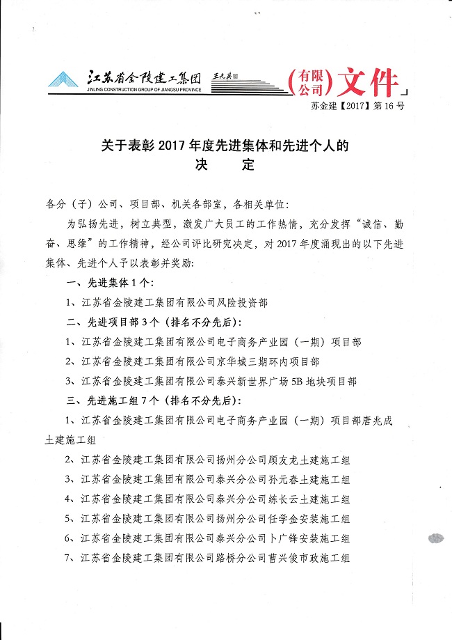 關(guān)于表彰2017年度先進集體和先進個人的決定